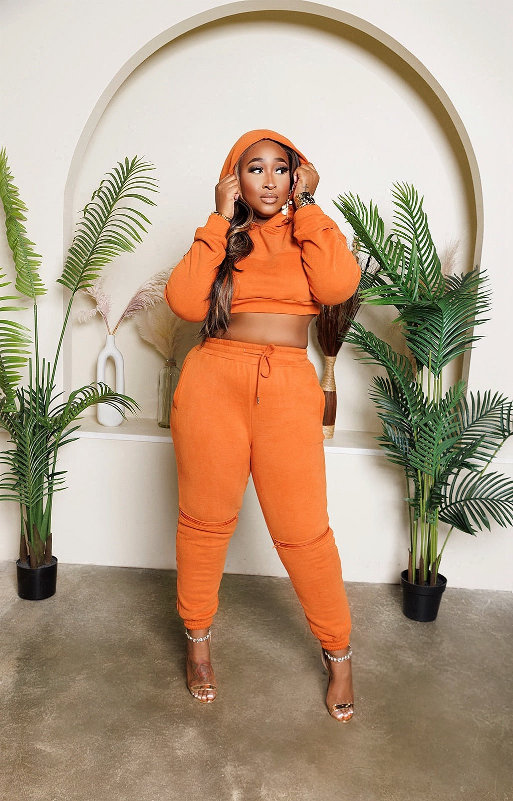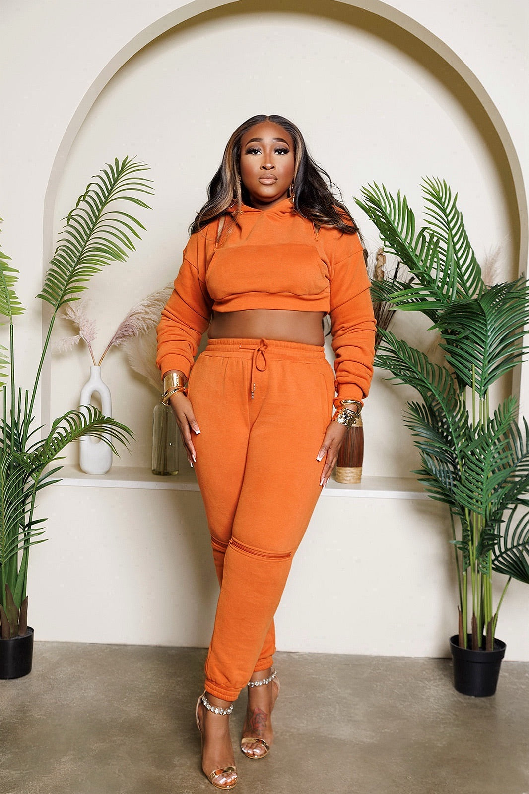The cozy hoodie features a back zipper across the shoulders that can zip open or close. The matching pants with pockets features a zipper detail on the knee that can open or close. Crafted for the trendsetters that love  individuality.